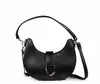 Cartera pequeña tipo "baguette" con hebilla niquelada al frente. Logo grabado en lateral y correa desmontable.